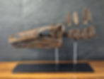 Velociraptor fossil skull on a stand